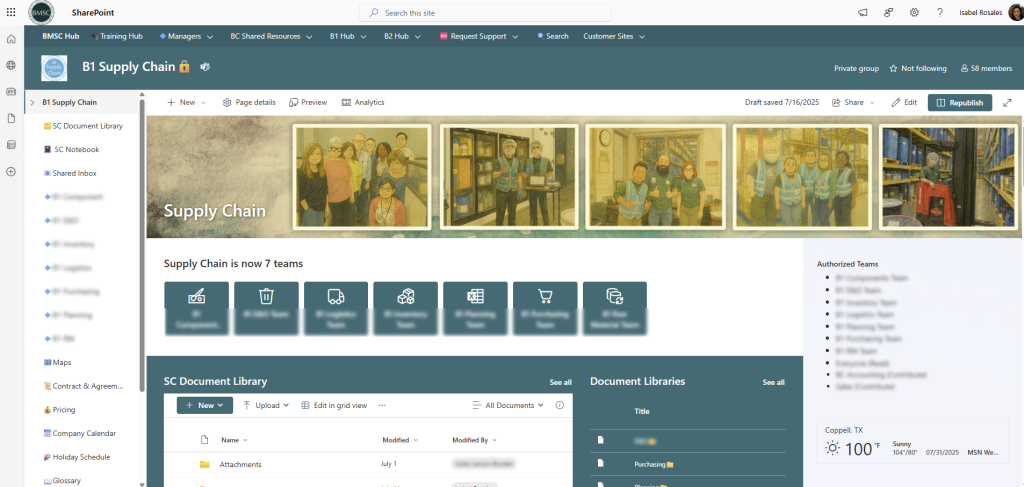 I also manage the SharePoint environment, with all sites organized under a central hub to provide a unified global navigation menu. Each site follows a consistent layout to ensure a streamlined and user-friendly experience across the organization.